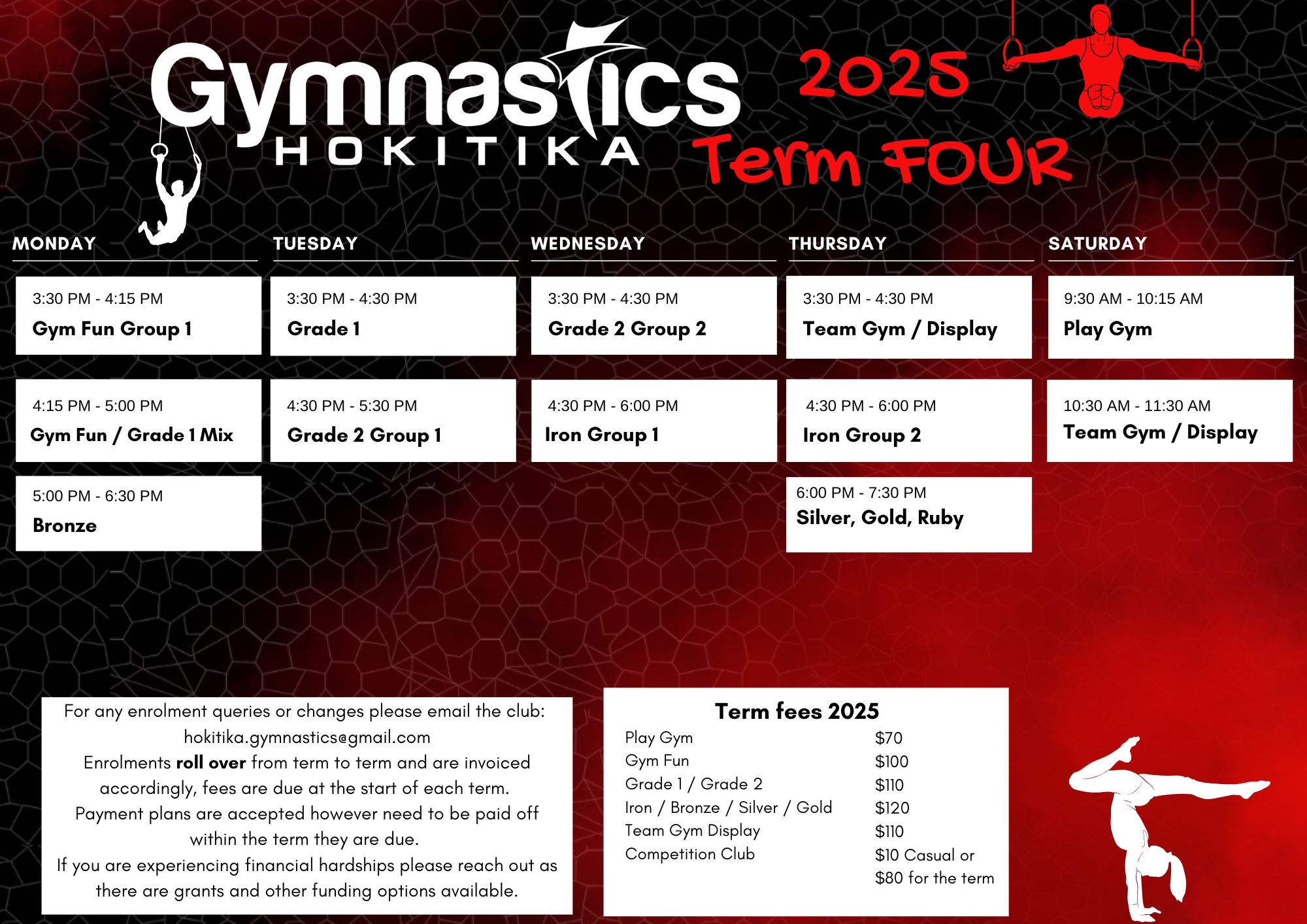 Here you can see the timetable for the term, contact information and register your children for gymnastics.